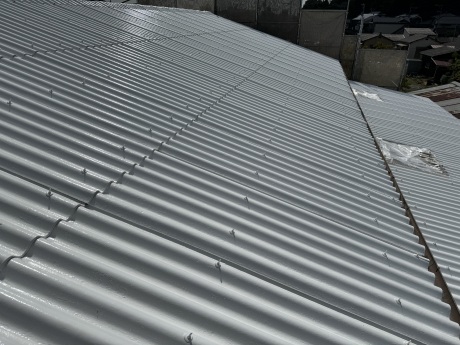 スレート屋根の遮熱塗装を施工しました。高圧洗浄で長年の苔や汚れをしっかりと落とした後に、遮熱専用シーラー 下塗り、遮熱塗料(クールホワイト)2回塗りにて塗装!塗る前と塗った後では屋根表面を触った時に熱も下がっているのを実感できました。お客様の方からも中の温度が全然変わったとのお声も頂きました!