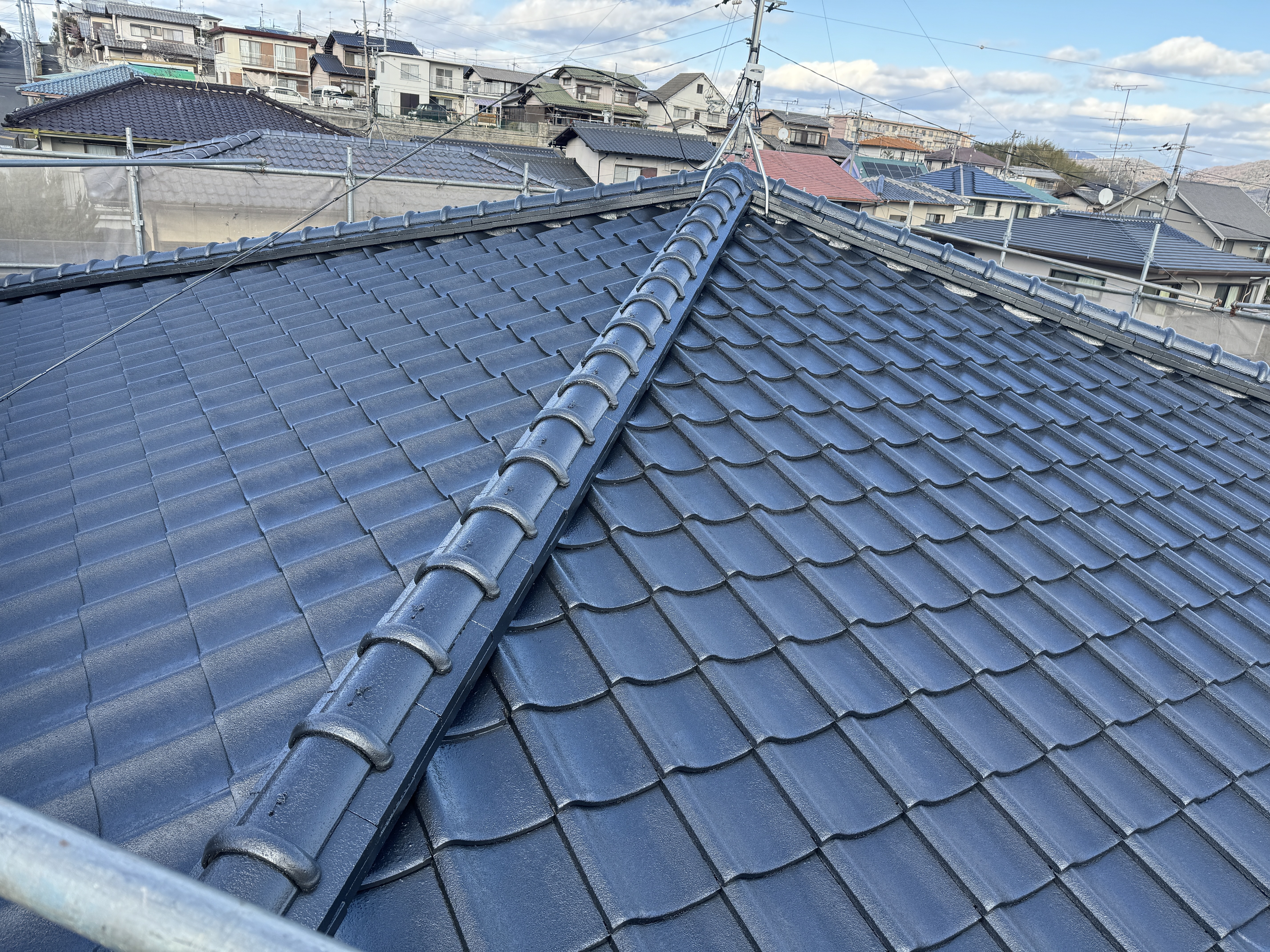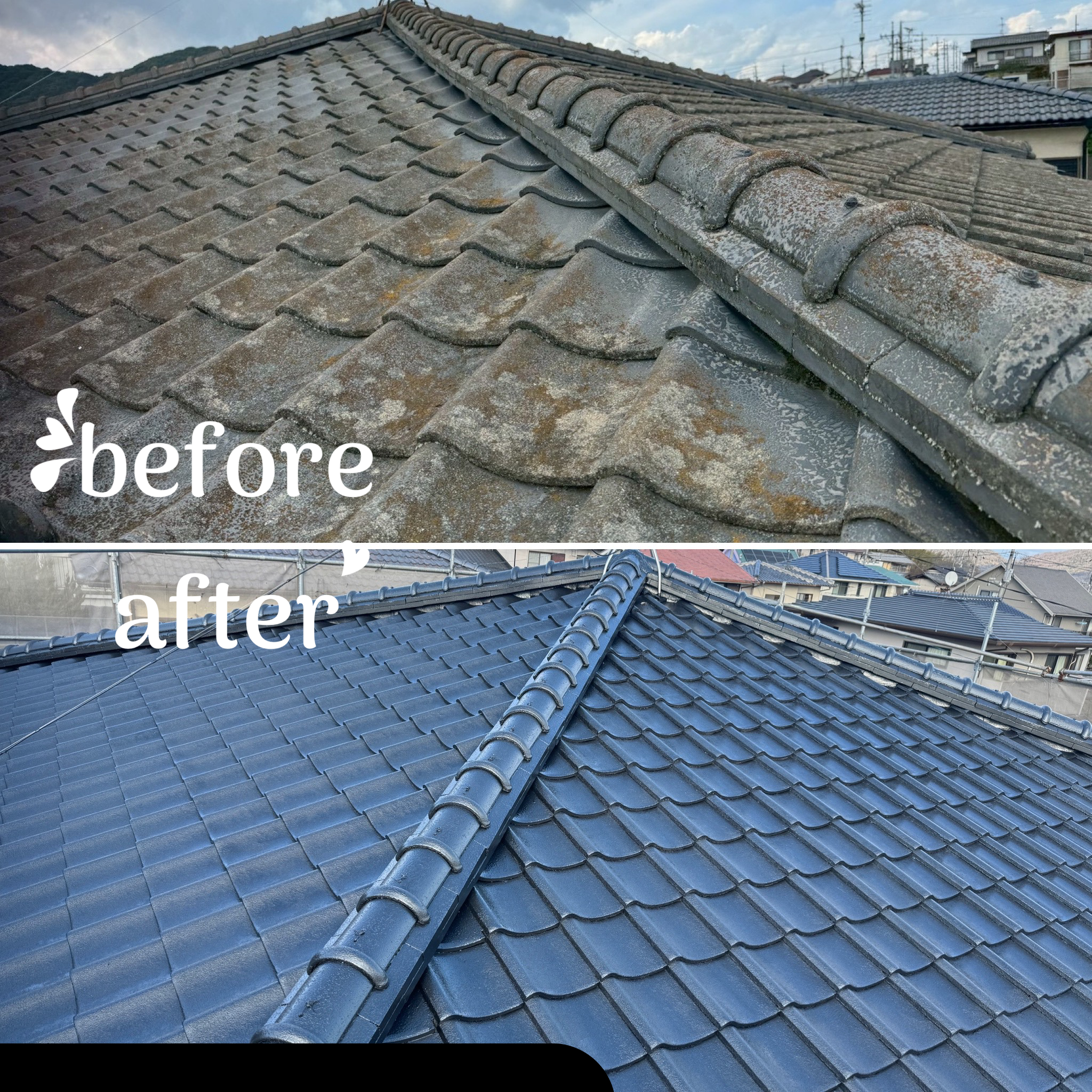 先日完工したセメント瓦の塗装before&after写真です。 高圧洗浄+急塗膜除去清掃、水系ルーファーEX下塗りをしっかり塗装し下地を作った上でシリコン樹脂塗装を行いました^_^ 銀黒のメタリック仕上げでとても美しい仕上がりに⭐︎ 塗装することにより防水性、耐久性にも優れ瓦を守ります。