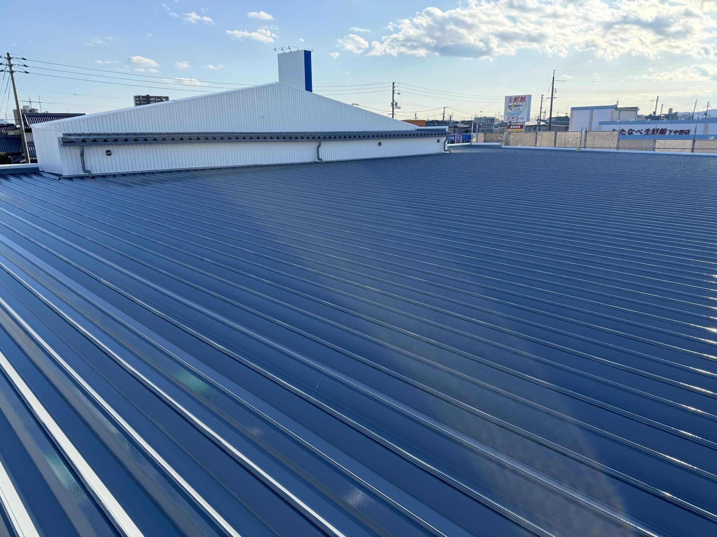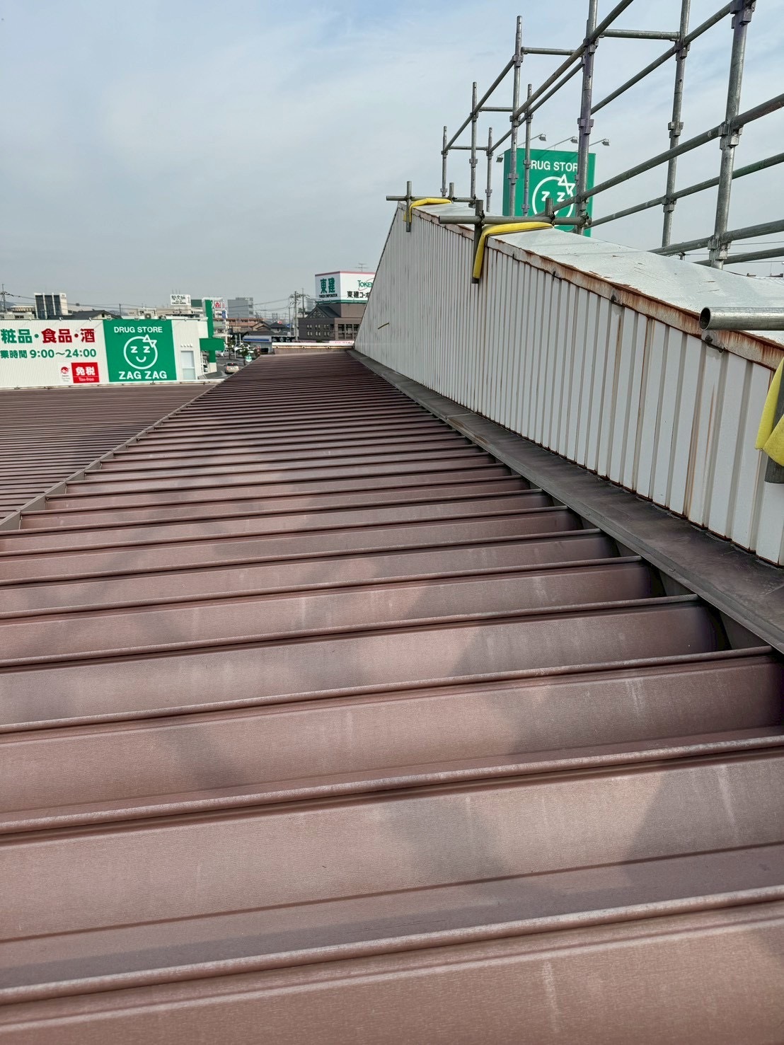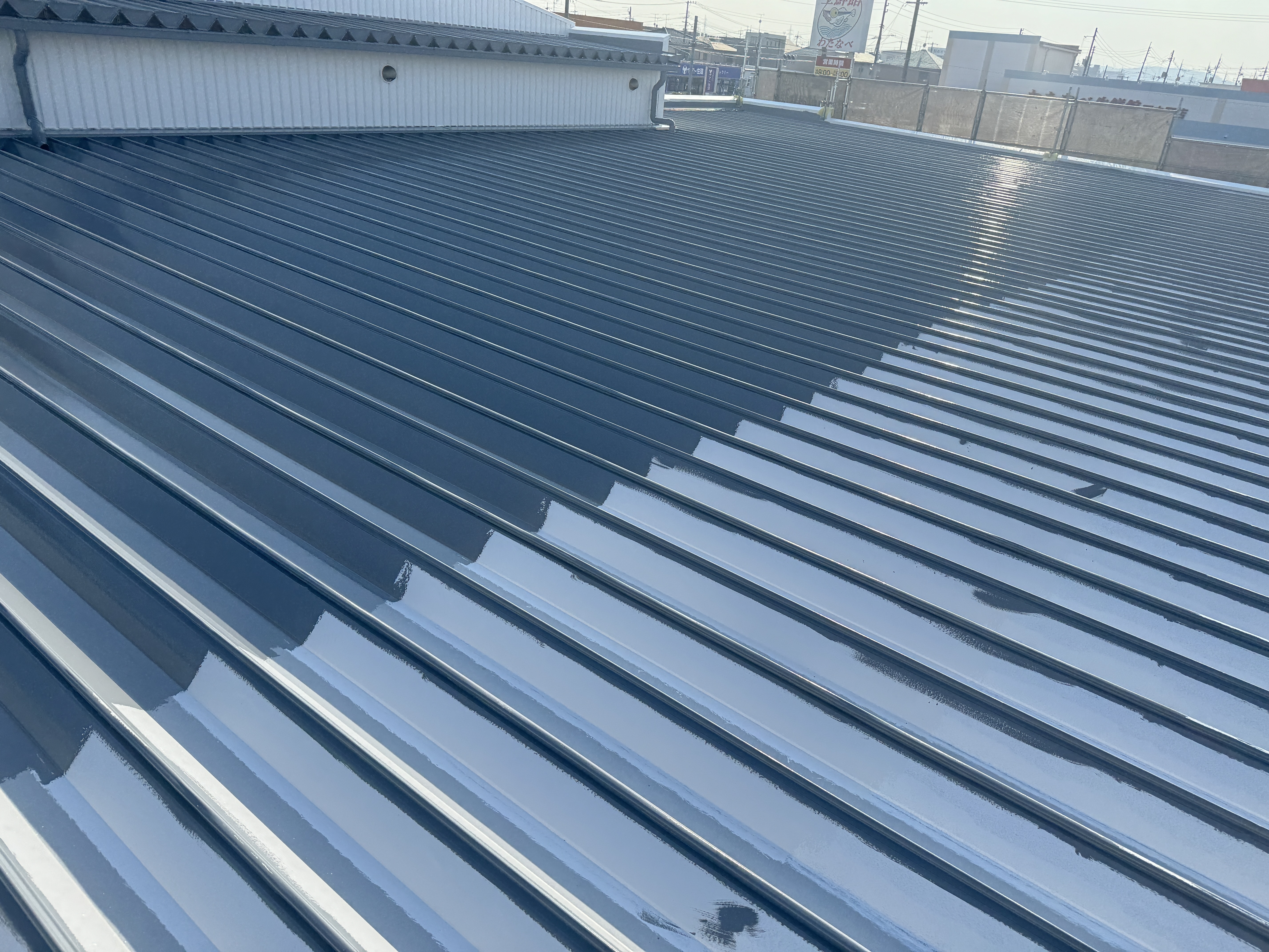 岡山市にて店舗の折板屋根塗装改修工事を施工しております♪ 1000平米超えの屋根なので塗りごたえがありますね^_^ しっかりと下地処理を行い3回塗りの塗装で仕上げていきます♪ しっかりとした塗装を行う事で建物の保護、防水性、防錆性、耐久性のアップに繋がり建物を守ります!