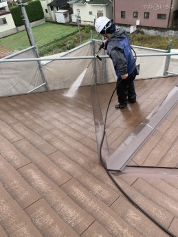 岡山市北区 K様邸屋根.外壁塗装工事が着工!まずは足場架設工事も無事に終え、高圧洗浄です。高圧洗浄は塗り替えにとってとても重要な事ですので細部まで入念にしっかりと汚れを落としていきます☆