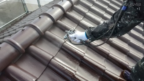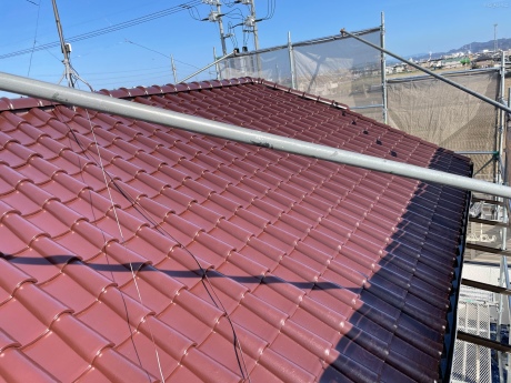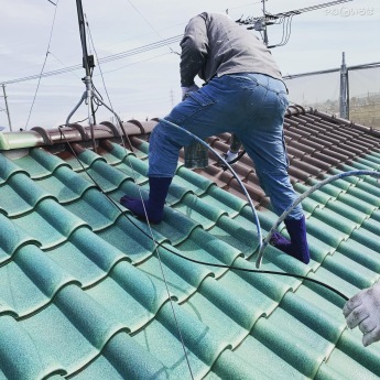 岡山市で陶器瓦、外壁塗装工事をしてます❗️屋根は既存グリーン色からチョコレート色に塗装です欲しいトウキマイルド塗装(2回)、乾燥おいてタフグロスコートクリヤーで紫外線劣化を防ぎ美観を保たせるよう仕上げました^_^屋根も外壁もピカピカです✨