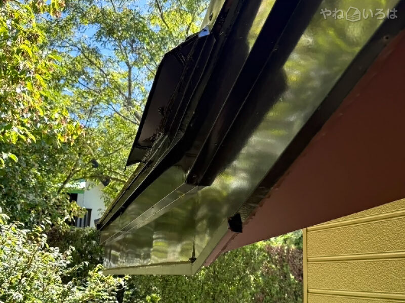 お客さまより「雨漏りしている」との連絡をいただき、現地調査に伺いました。軒天塗装をしたのに雨漏りしていて軒天の塗装が剥がれ、ケイカル板がボロボロになっていました。谷先端部の処理が甘く水が回り込んでいるようで、長い年月をかけ木が腐り最近になって軒天まで染みてきたようです。お客さまと谷先端部から処理していくことに決めて、施工しました。大工工事、塗装工事を経てほぼ同色で仕上げることができたので、お客様に喜んでいただけました。