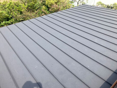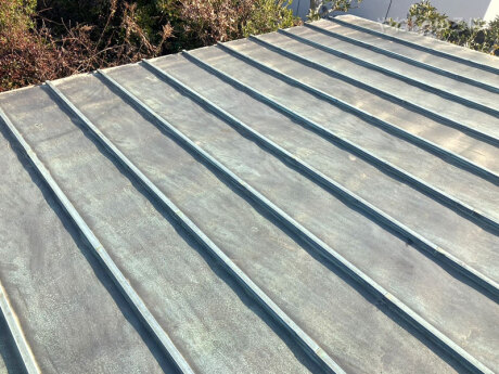 お客さまから「築40年瓦の2建ての戸建です。昨日の強風で1階の庇の銅板部分が2.3畳分めくれあがってしまい、ブロックで押さえている状態です。早めに見てもらいたいです。」との連絡があり、現地調査に伺いました。後日板金屋根部分と雨樋をすべて新品へ交換しました。