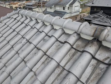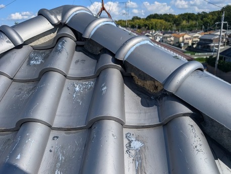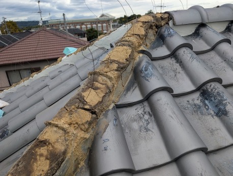 防水性のある漆喰が落ちてしまうと葺き土が水を吸って弱ってしまい、雨漏りの原因になります。棟瓦を下ろしたところです。