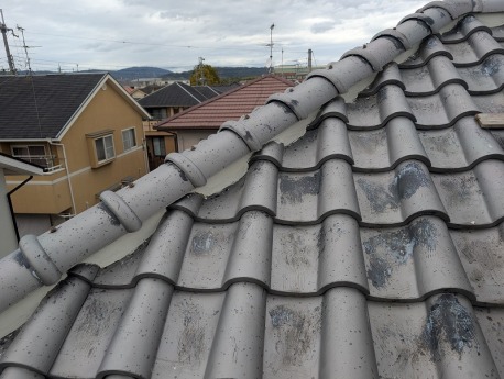 奈良県生駒郡斑鳩町の屋根修理業 孫七瓦工業㈱です。通勤途中の街路樹が赤、オレンジ、黄色に色を変えとてもきれいな季節になりました。途中に通る紅葉の名所からほど近い駐車場付近では紅葉狩りに来られたのだろうと思われる方々が結構歩いておられます。今週の穏やかな青空を背景に紅葉を写したら、きれいな写真が撮れるでしょうね。さて、数日前の施工写真です。棟漆喰が劣化して落ちてしまい葺き土が覗いていたのを、修理・漆喰の塗り直し施工をさせていただきました。手前は陰になって分かりにくいですが、奥の降り棟の漆喰がかなり落ちているのが分かります。