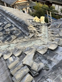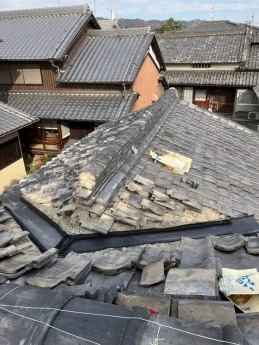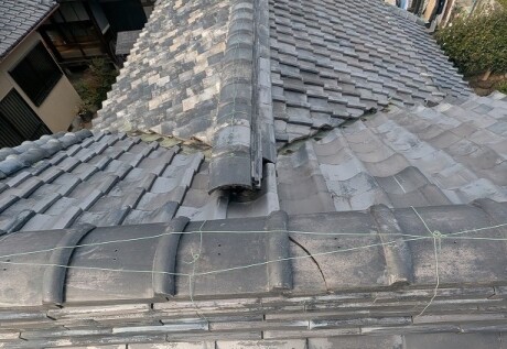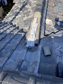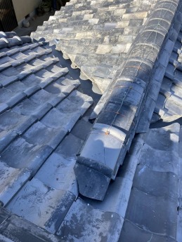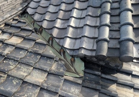 先ずは谷の周囲の瓦を取り除いて、防水施工を行っていきます。次にステンレス製の谷板を施工します。谷の周囲の瓦を積み直して、棟を積み直します。完成写真では涙模様のない谷板がご覧いただけます。