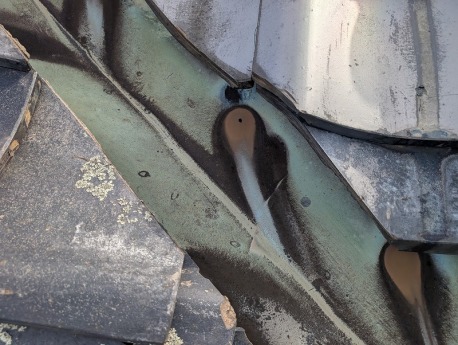 奈良県生駒郡斑鳩町の屋根工事業 孫七瓦工業㈱です。孫七地方では今朝、雪がチラついていました。地球温暖化の影響でしょうか、昔は冬になるとバケツの水の表面に氷が張って、それを割って蹴って遊んだりしたものですが、昨今バケツに氷が張るなんてことは冬の間に1度あるかないか。寂しいような嬉しいような師走です。さて、雨漏りでお困りのお屋根を修理しましたのでご紹介します。手前からV字に屋根の谷があるのですが、経年劣化で傷みが出ていました。銅製の谷板に茶色く大きな涙型の模様が出ています。この涙模様が薄く表れ始めたら、谷板交換時期の目安です。大きく写した写真では、穴の開いた様子が写っています。