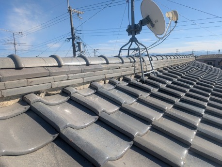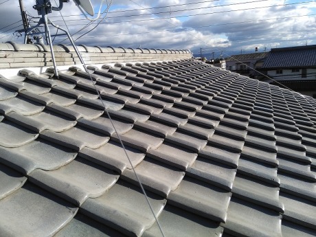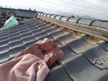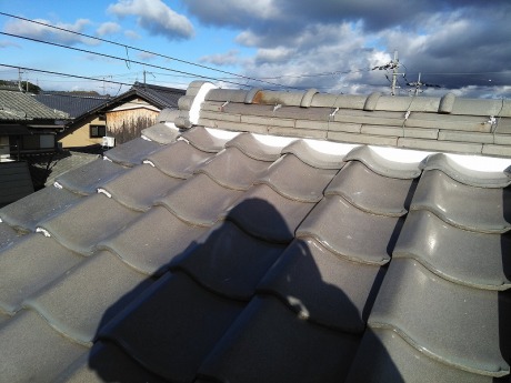 鬼瓦の周囲と棟に新しい南蛮漆喰が塗られました。真っ白で綺麗ですね。新しい南蛮漆喰が雨水を吸い込まないように、のし瓦の下に収まるように押し込んで仕上げています。瓦と漆喰の耐久年数にはかなりの差がありますので、築20年以上になれば、定期的に点検を行い漆喰の欠けや黒ずみが気になりだしたら、漆喰の塗り直しを検討してください。奈良県、大阪府で、屋根修理・屋根補修・屋根点検・葺き直し・葺き替え・雨漏り修理・屋根瓦の新築・屋根リフォーム・瓦修理・外壁塗装・波板交換・雨樋修理をご検討なら孫七瓦工業へ。瓦1枚の交換から駆け付けます。保険利用の案件も対応させて頂いております。