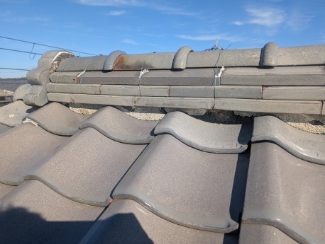 奈良県生駒郡斑鳩町の屋根工事業 孫七瓦工業㈱です。2024年12月の第4週です。つまり今週金曜日で本年度の営業が終了となります。今年度中に施工完了予定の現場へ、職人さんたちは今日も伺って作業を行っていますが、吹く風が強く冷たい季節なので屋根の上、大丈夫かなぁ・・・と気になる昨今です。さて、先週完了した棟の漆喰の塗り替え写真が届いていますのでご紹介します。こちらの写真は、現場調査時の写真です。鬼瓦の周囲や棟の漆喰が所々欠けて落ちてしまっています。築年数が10年、20年、30年と経つにつれ経年劣化でどの家でもこのように漆喰が落ちたり、黒ずんだり、葺き土が流れ出したりという症状が出てきます。