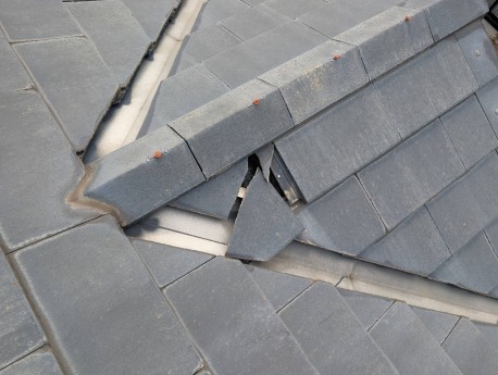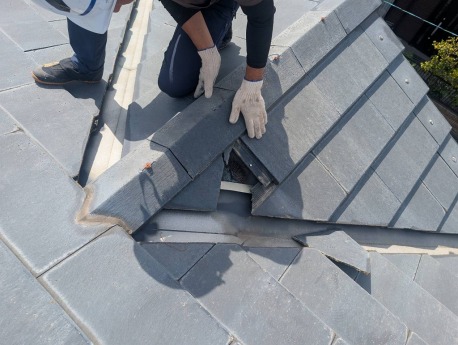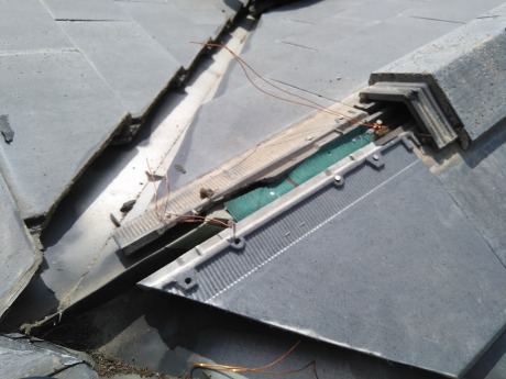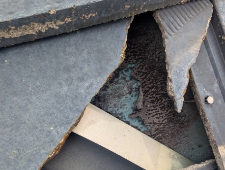 奈良県生駒郡斑鳩町の屋根工事業 孫七瓦工業㈱です。、「屋根が割れているので見てほしい」というご依頼で現場調査をさせて頂いた案件の修理が完了しました。最初に破損写真を拝見したときは「アララ・・・・これ雨漏り大丈夫かなぁ??」と気になったのですが、施主様のご希望で施工日まで日数が開いてしまいました。途中には雨の日もあったと思うのですが、大丈夫だったのでしょうか?先ずはBefore写真です。ヒビが入ったとか、欠けたというのではなく、あえて言うなら “見落とすことのない破損” です。下に見える黒い防水シートが捲れているように見えます。