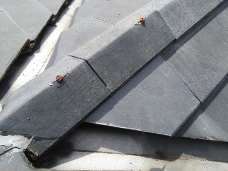 ここからはAfter写真です。これから破損瓦を交換します。新しい瓦に交換してビスで留め付けます。冠瓦を乗せて、ズレないように銅線で緊結施工しました。奈良県、大阪府で、屋根修理・屋根補修・屋根点検・葺き直し・葺き替え・雨漏り修理・屋根瓦の新築・屋根リフォーム・瓦修理・外壁塗装・波板交換・雨樋修理をご検討なら孫七瓦工業へ。瓦1枚の交換から駆け付けます。保険利用の案件も対応させて頂いております。