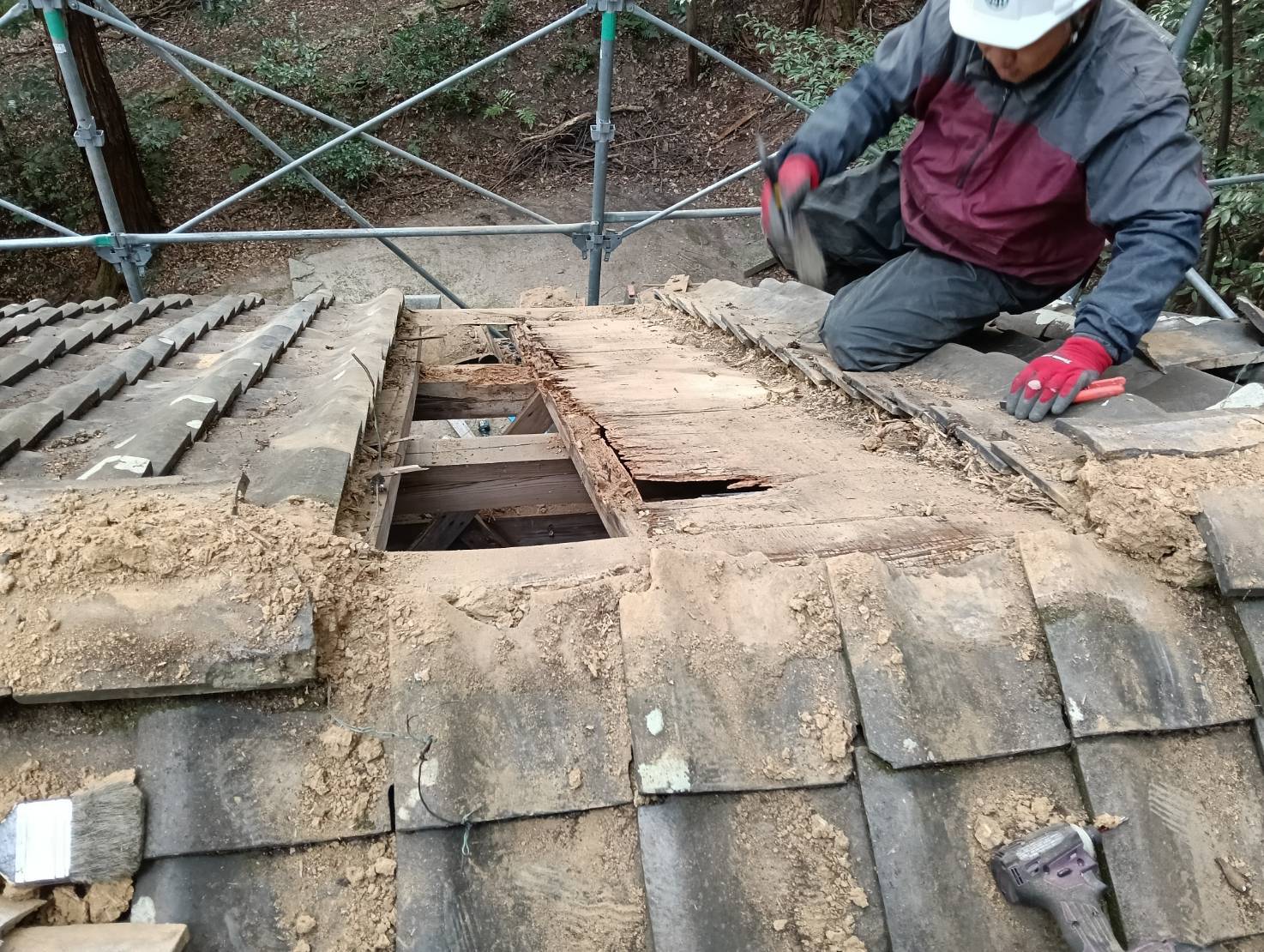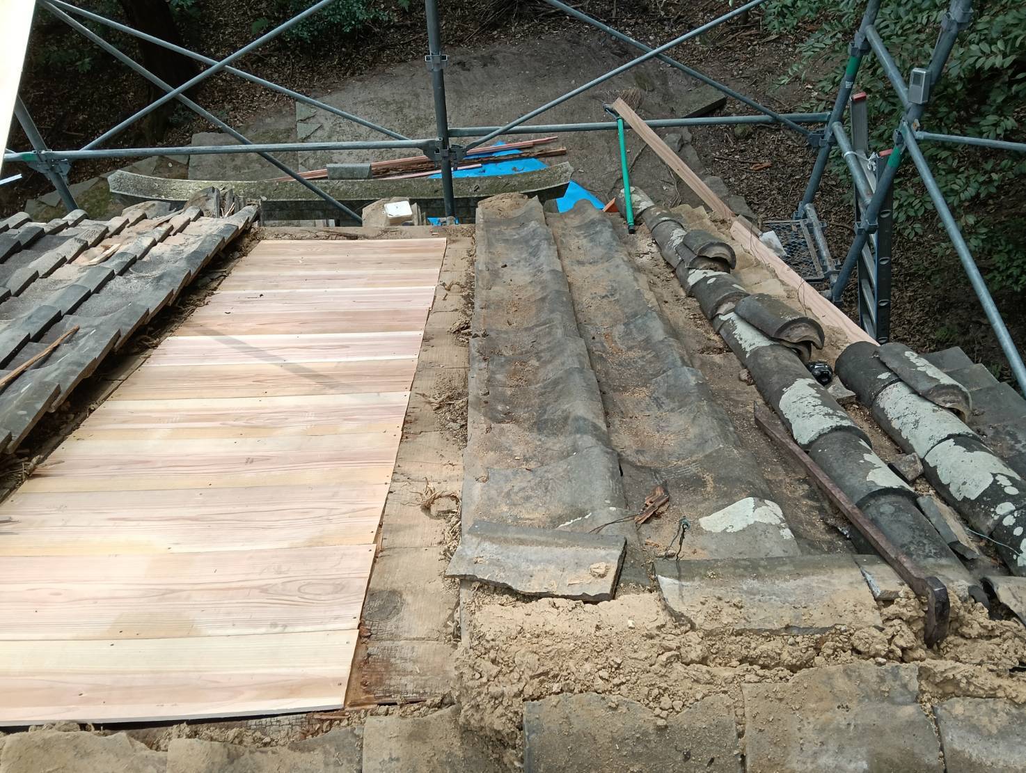 傷んだヶ所の屋根下地を部分修理して、瓦を葺き直しました。 再利用不可能なヶ所を取り除き、新しい下地を施工。