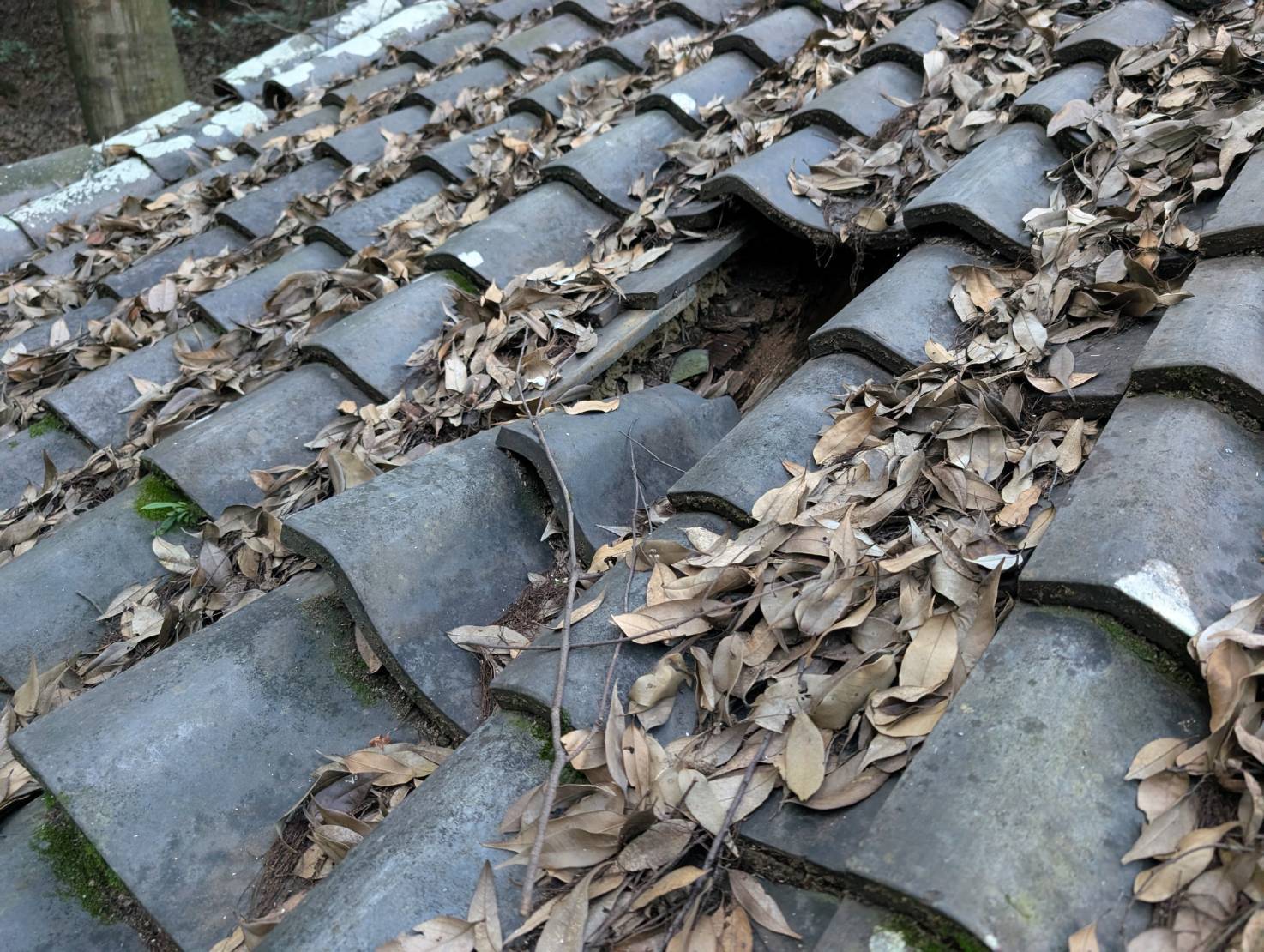 昨年現場調査をさせて頂いた、お宮さんの屋根修理が完了しましたのでご紹介します。 年代物の鬼瓦が乗ったお屋根には、屋根下地に穴が開き、鬼瓦の周囲には草も生えていました。 枯葉に隠れて傷みが分かりづらいお屋根。 下から見上げると、漏水で木部が腐食して屋根下地が抜けている個所もありました。