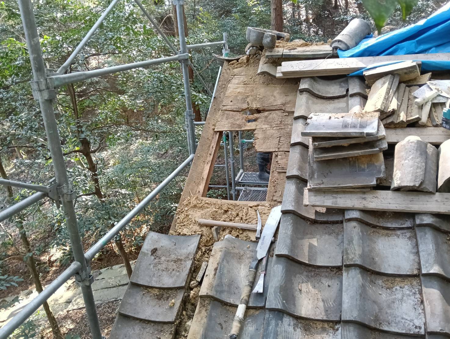 防水シートを敷きこんで瓦を復旧させていきます。 このお宮さんのある場所は樹木に覆われていますので、落葉だけでなく、枝が落ちることも無視できません。 定期的なメンテナンスが不可欠です。