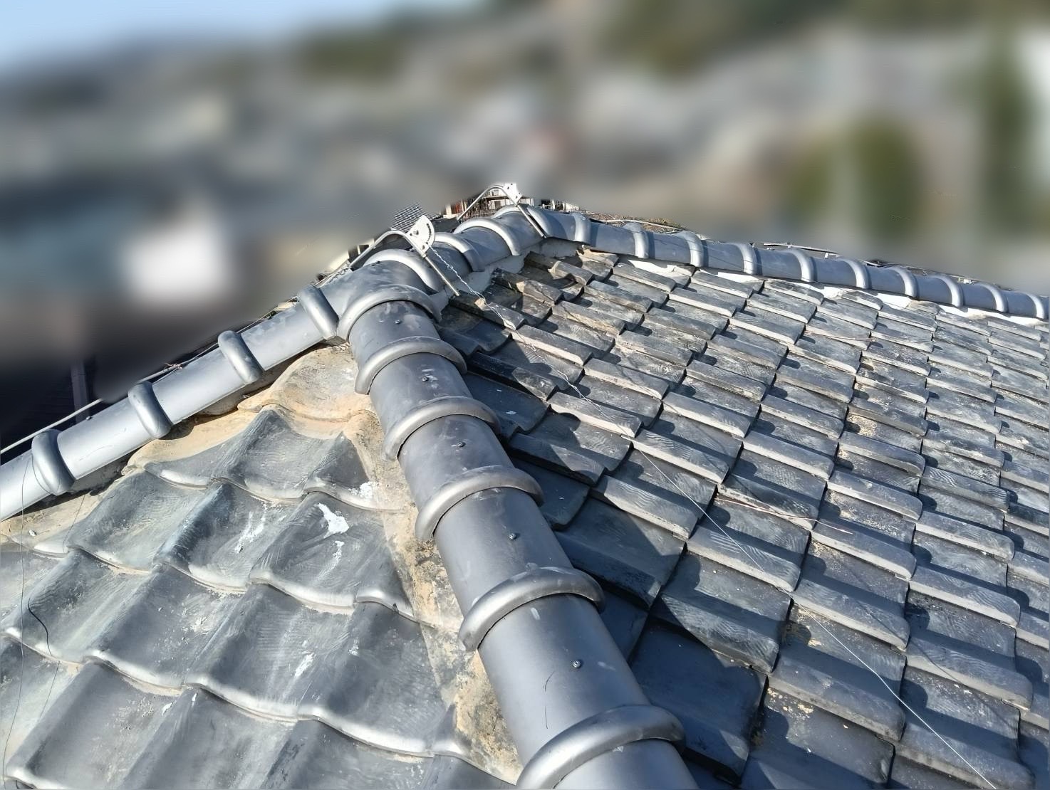 雨漏りでSOSのご連絡をいただいたお客様のお屋根、下地木部の腐食や漆喰劣化の修理と、強力棟工事を承りましたのでご紹介します。 見積時の2階屋根です。 漆喰が劣化して瓦に落ちていたり、鬼瓦周りや棟でも劣化が出ていました。