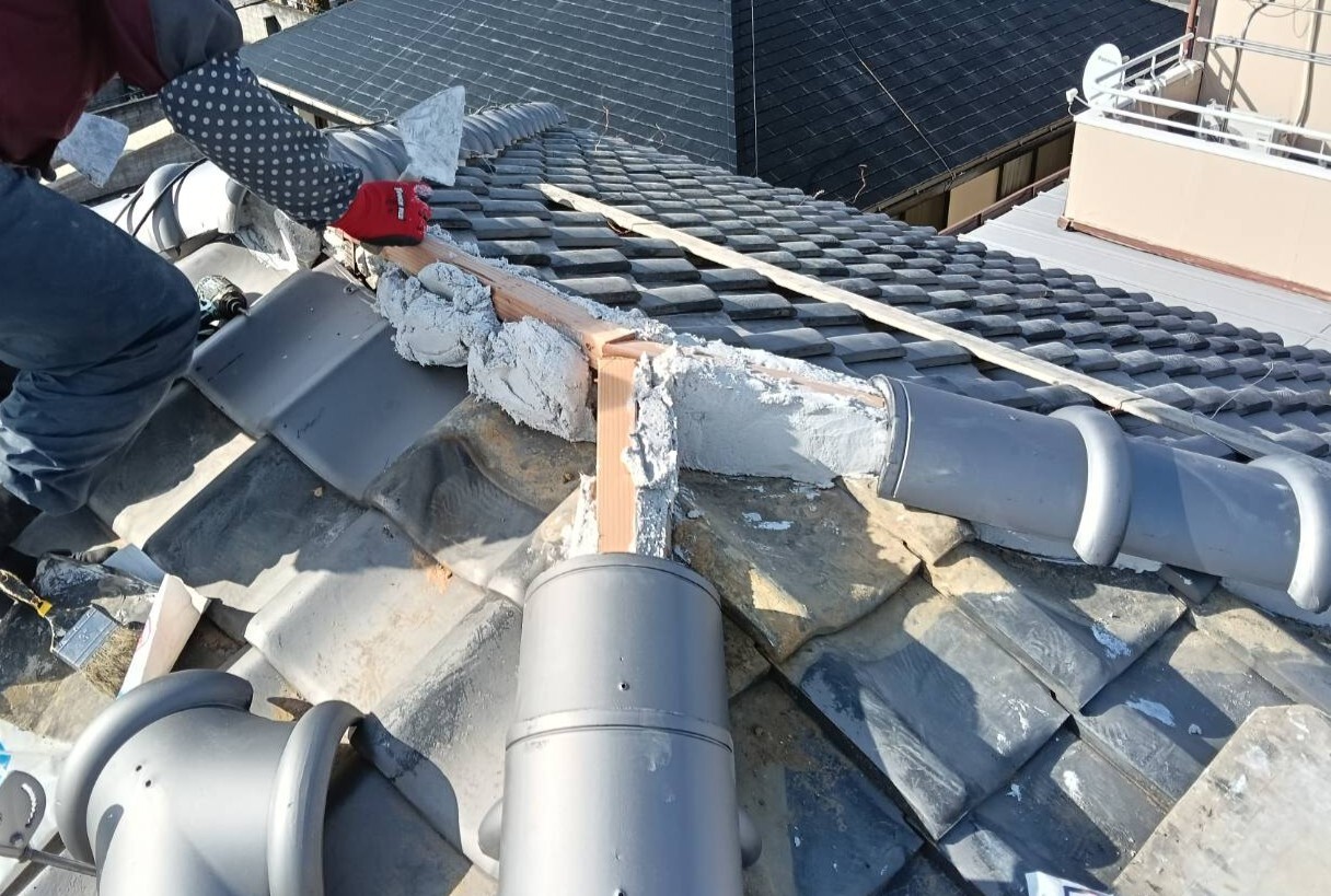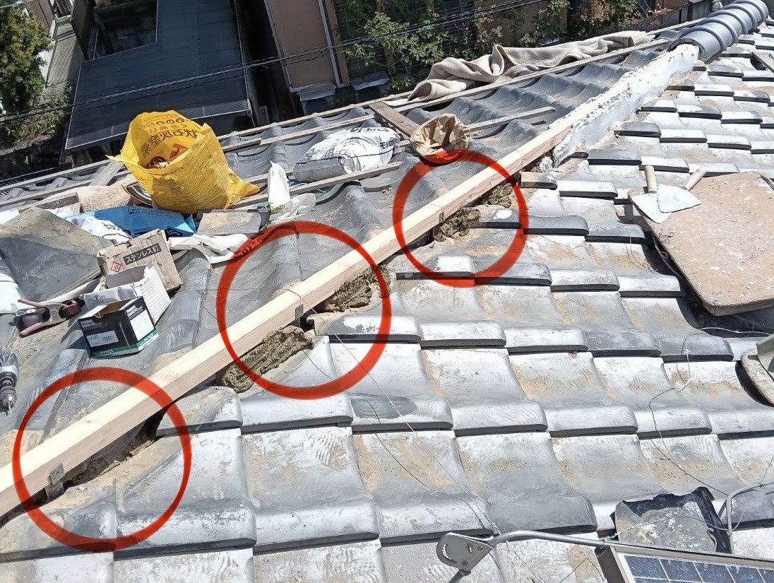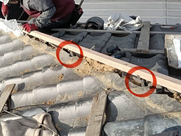 修理前の屋根にはなかった、強力棟を施工しています。 強力棟の取り付け金具(赤丸)で棟の土台となる木材を取付け、防水効果のある漆喰を施工して冠瓦を葺いていきます。