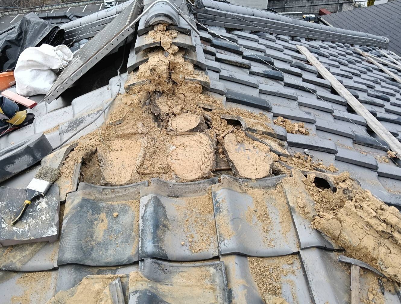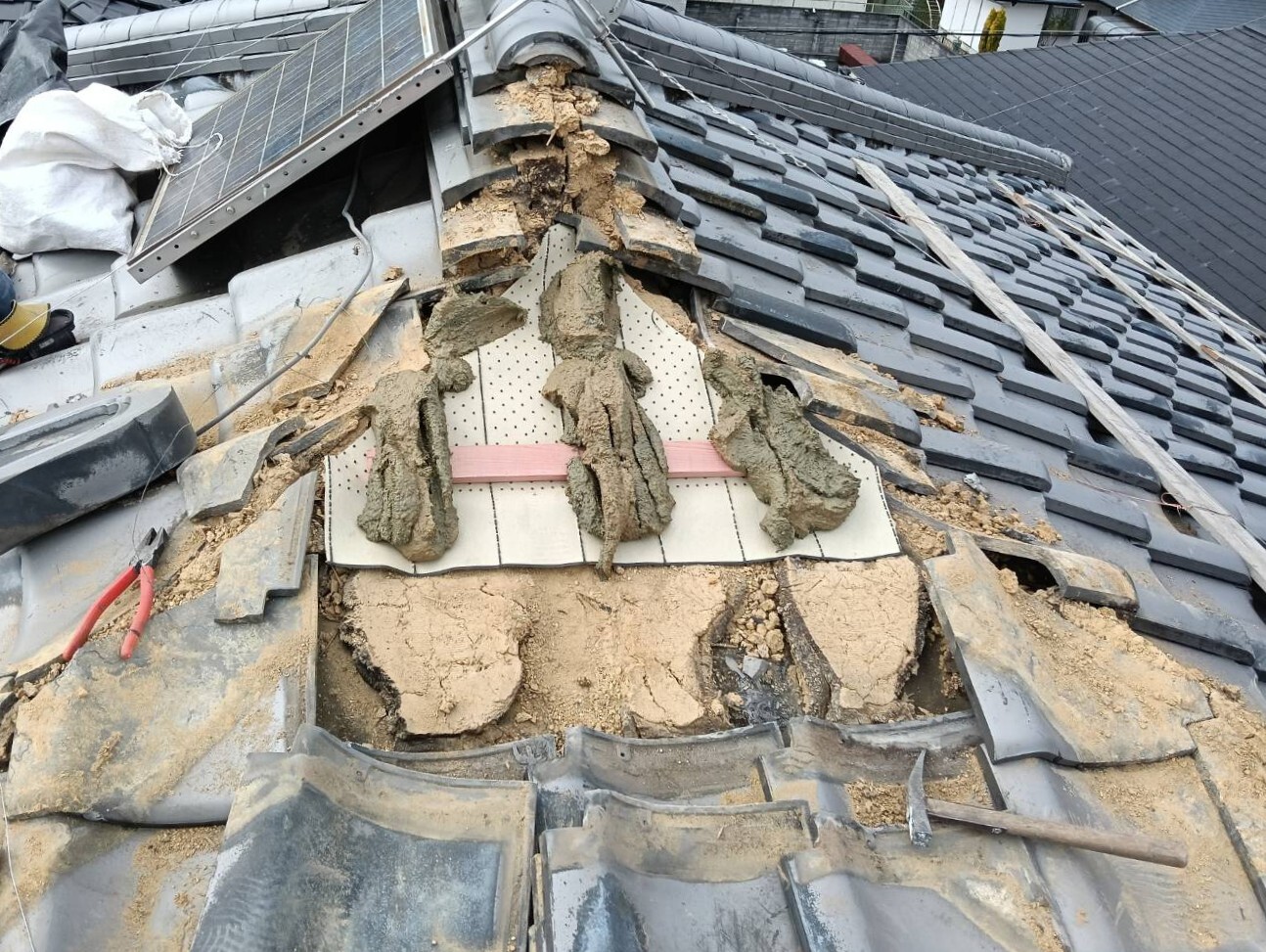 棟瓦を解体しているところです。 葺き土の上に瓦が乗せられ、何か所かで留め付けれれている葺き方です。 雨漏りの問題個所である下地木部の腐食ヶ所を修理して 防水シート、土が乗せられたところです。