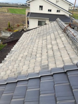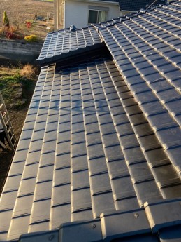 「雨漏りしている箇所が5カ所ほどありますので、確認してほしい」と電話でお問い合わせがありました。現地調査を行ったところ、経年劣化で棟部分の下地が腐り、瓦がズレ下がっていました。その他の屋根材も劣化が激しかったため、葺き替え工事のお見積もりを作成し、今回の工事を行うことになりました。工事後は、お客様から「ありがとうございました。これで安心できます」とお声掛けいただきました。