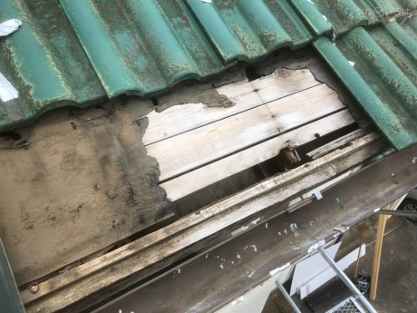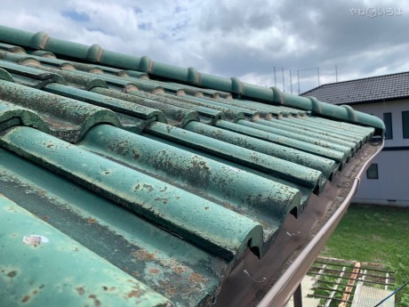 お客様から「台風により屋根の瓦が2枚落ちました。他も損傷しています」と連絡がありました。現地調査したところ、モニエル瓦(廃版の瓦)だったため、同業者に問い合わせをして分けていただき、グリーン色に塗装して差し替える形で復旧しました。また、飛んだ瓦の幹先の下にある幹天が痛んでしまっていたため、こちらも復旧しました。工事終了後にお客様から感謝のお言葉をいただきました。※金額には足場代を含みます。