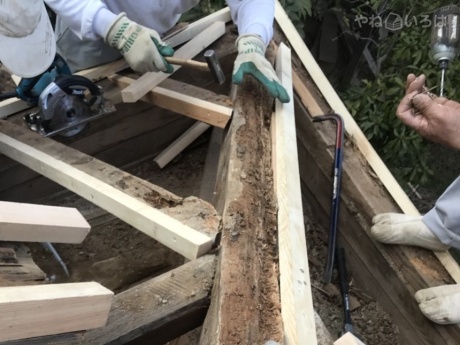 まずは瓦のズレからの浸水で傷んでいた下地や木材を、新しいものに取り替えました。