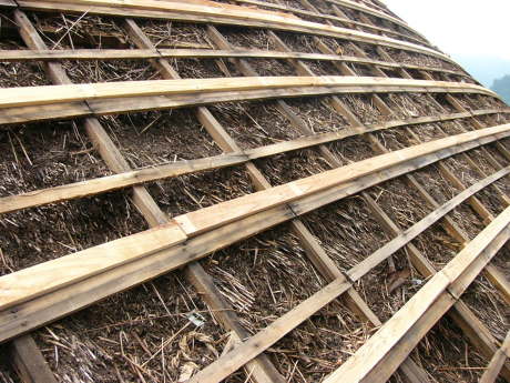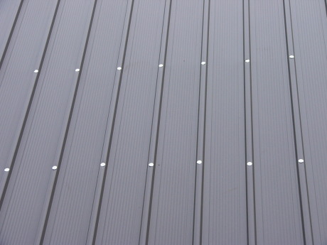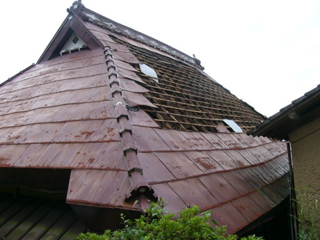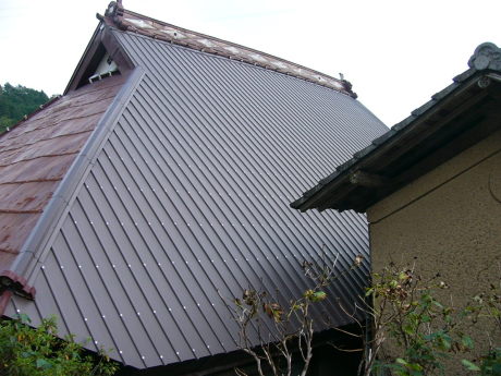 萱葺き屋根の上に下地を組んでトタン板を葺いていましたが、強風により、吹き飛んでしまったようです。お客様の要望はできるだけお安いほうが嬉しいけど、いくらなんでも波トタンの屋根は欲しくないと言うことだったので、角波ルーフを選択し、サンプルを見ていただいてご納得のうえ、工事を行いました。27×60の松材により補強を行い、吹き飛んだ面だけの改修としています。また、再利用できる物はできるだけ再利用しました。施工方法は、波トタンと同じように表面から釘を打って固定しますが、上から下まで1枚物なので途中から雨漏りしたり、錆が発生したりということがありません。施工地 岡山県鏡野町
