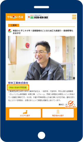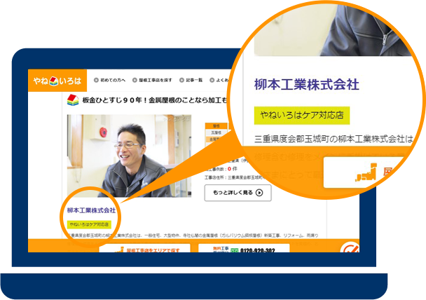 「やねいろは」は当社規定の掲載基準をクリアした、顔が見れる地元の屋根工事店のみ掲載。お客様自身が直接、地元の屋根工事店に依頼が可能です。屋根工事依頼をお考えの方は、ぜひご活用ください。