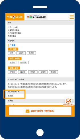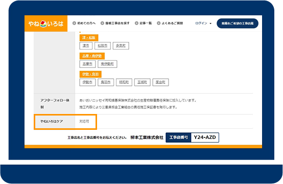 ※工事店ページの問い合わせフォームから必ずお申込みください。電話によるお問い合わせや「やねいろは」を介さず直接工事店へ連絡を行った場合は、「やねいろはケア」の適用はされませんのでご注意ください。